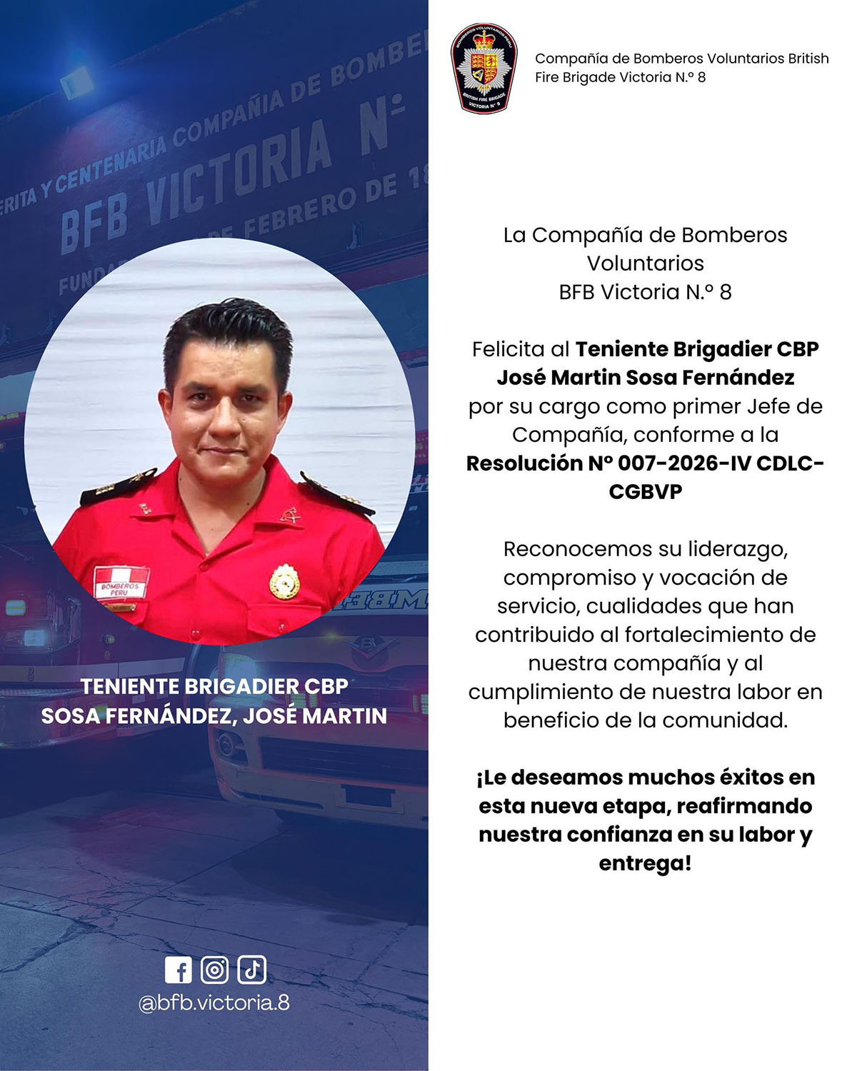 La Compañía de Bomberos Voluntarios BFB Victoria N.° 8 felicita al Teniente Brigadier CBP José Martin Sosa Fernandez, quien asume el cargo de Primer Jefe de Compañía, conforme a la Resolución N.° 007-2026-IV CDLC-CGBVP.