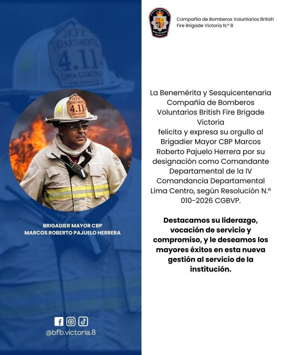 La Benemérita y Sesquicentenaria Compañía de Bomberos Voluntarios British Fire Brigade Victoria expresa su más sincera felicitación y profundo orgullo al Brigadier Mayor CBP Marcos Roberto Pajuelo Herrera por su designación como Comandante Departamental de la IV Comandancia Departamental Lima Centro, según Resolución N.º 010-2026 CGBVP.
