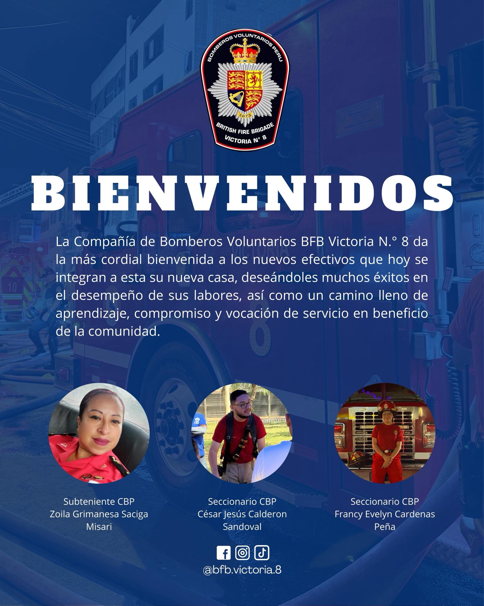La Compañía de Bomberos Voluntarios BFB Victoria N.° 8 da la más cordial bienvenida a los nuevos efectivos que se integran a esta su nueva casa, luego de haber culminado satisfactoriamente el proceso correspondiente, conforme a la Resolución N° 142-2025 CGBVP y la Resolución N° 144-2025 CGBVP, reafirmando su compromiso con el servicio, la disciplina y la vocación en favor de la comunidad.